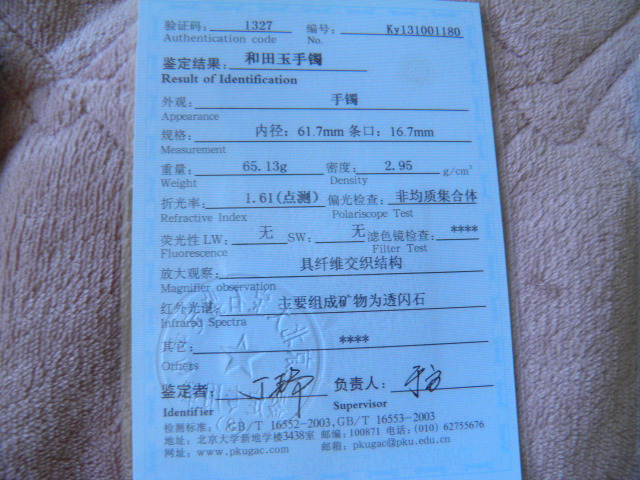 此手镯的鉴定证书照片: |