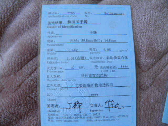此手镯的鉴定证书照片: |