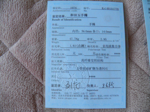 此手镯的鉴定证书照片: |