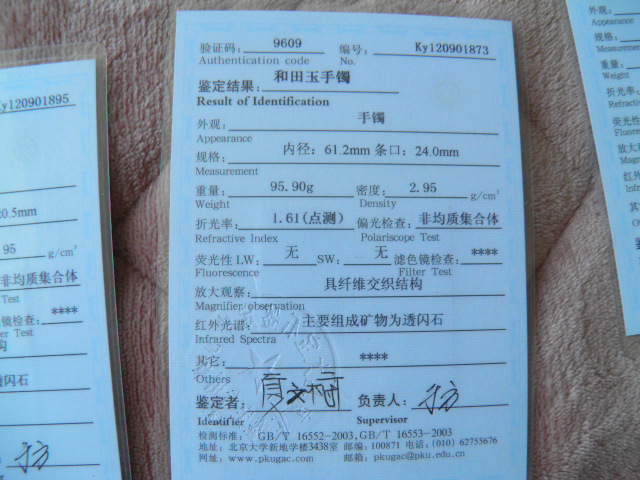 此手镯的鉴定证书照片: |