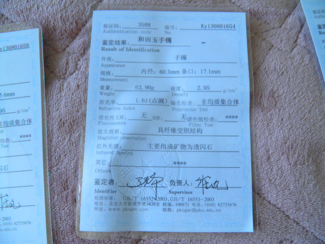 此手镯的鉴定证书照片: |