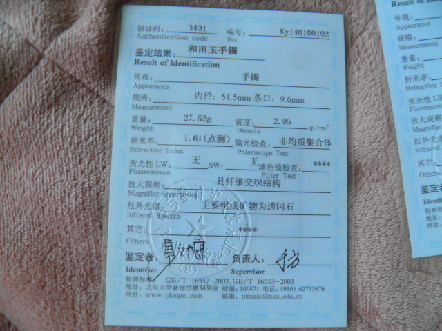 此手镯的鉴定证书照片: |