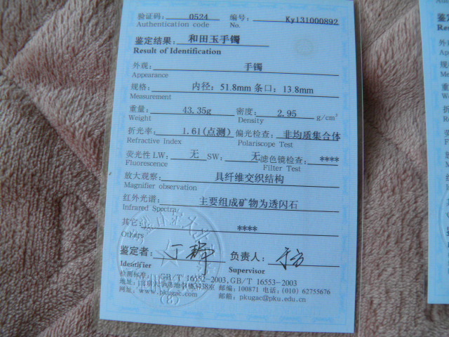 此手镯的鉴定证书照片: |