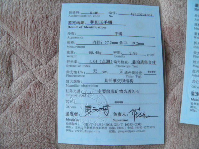 此手镯的鉴定证书照片: |