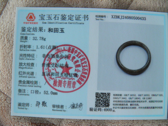 此手镯的鉴定证书照片: |