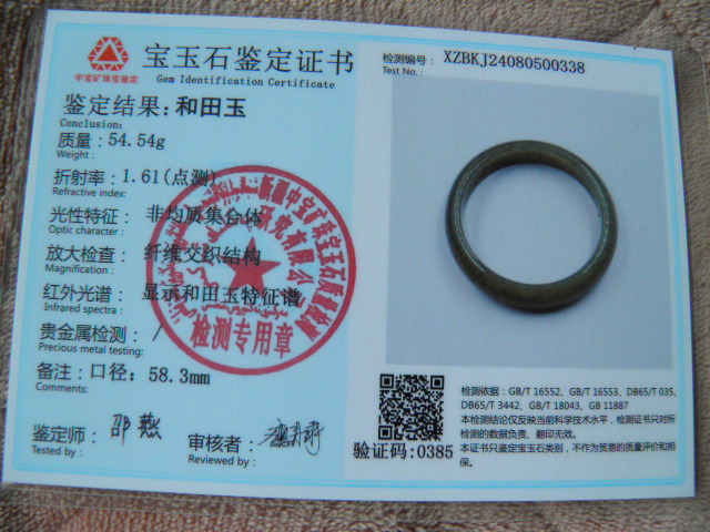 此手镯的鉴定证书照片: |