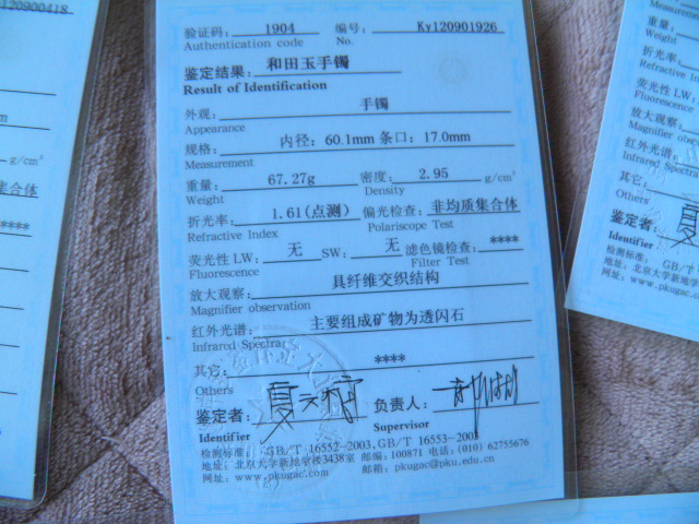 此手镯的鉴定证书照片: |