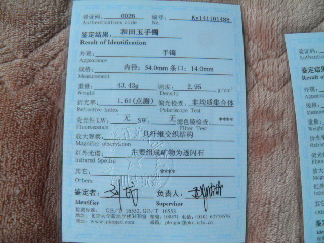 此手镯的鉴定证书照片: |