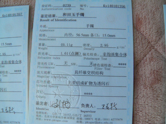 此手镯的鉴定证书照片: |