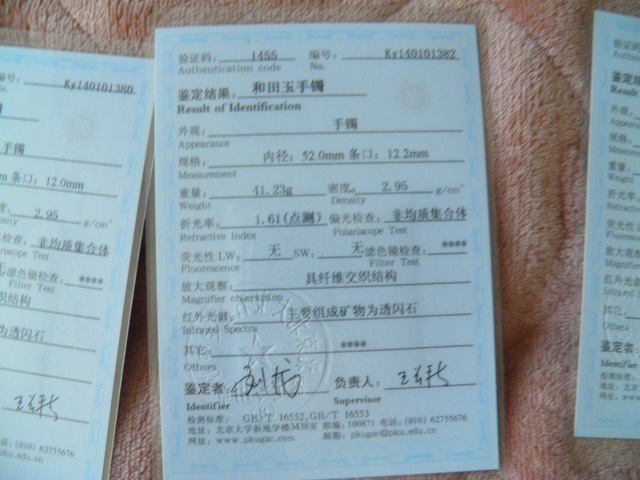 此手镯的鉴定证书照片: |