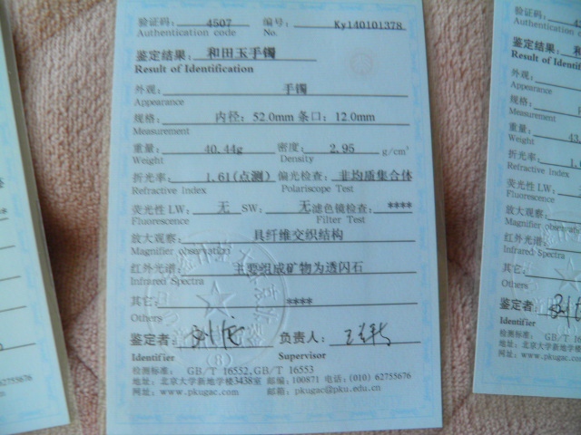 此手镯的鉴定证书照片: |