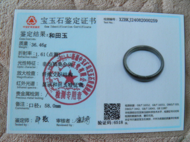 此手镯的鉴定证书照片: |