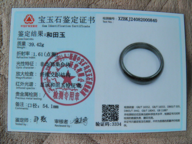 此手镯的鉴定证书照片: |