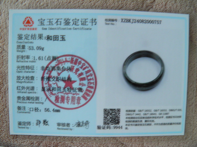 此手镯的鉴定证书照片: |