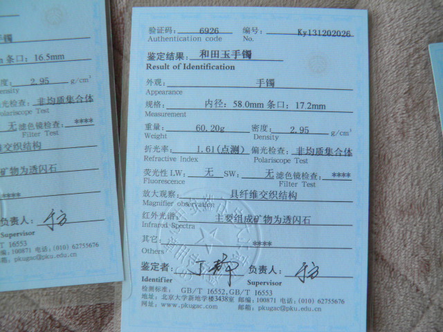 此手镯的鉴定证书照片: |