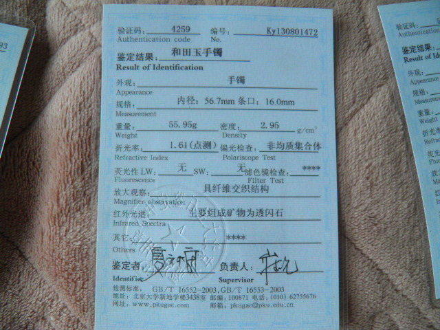 此手镯的鉴定证书照片: |