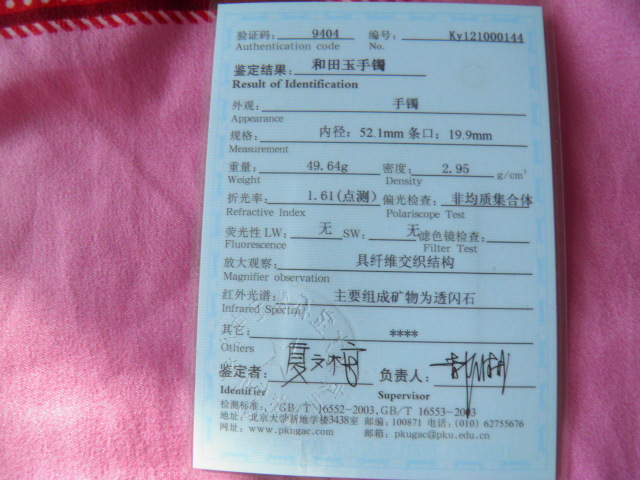此手镯的鉴定证书照片: |