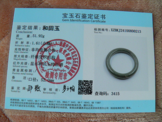 此手镯的鉴定证书照片: |