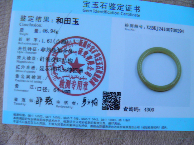 此手镯的鉴定证书照片: |