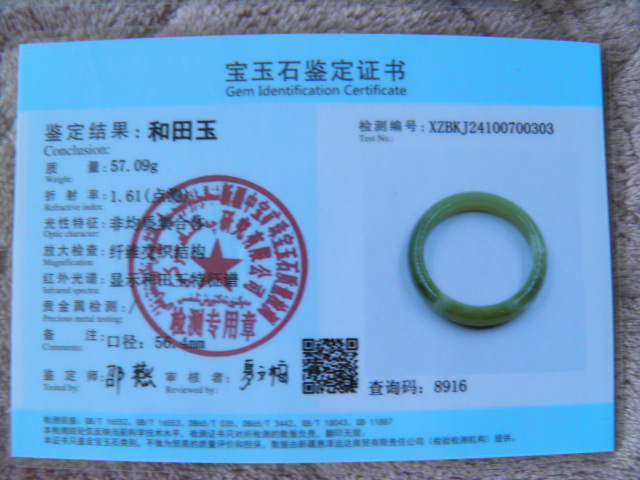 此手镯的鉴定证书照片: |