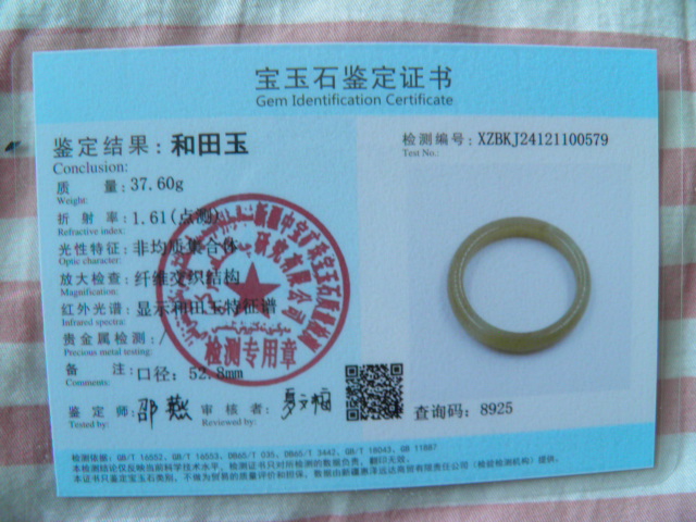 此手镯的鉴定证书照片: |