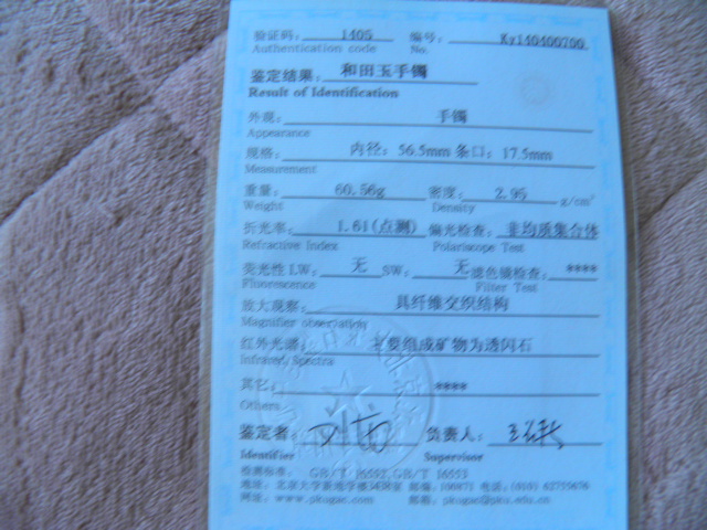 此手镯的鉴定证书照片: |