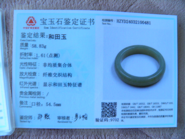 此手镯的鉴定证书照片: |