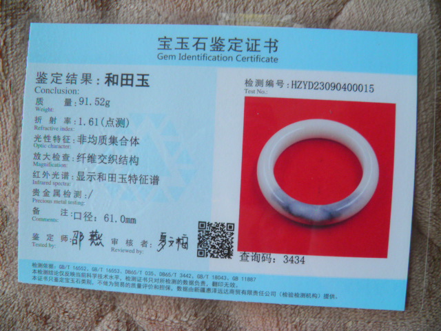 此手镯的鉴定证书照片: |