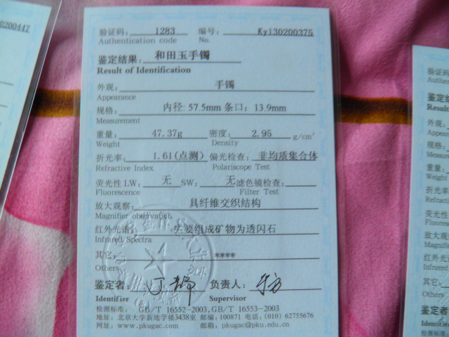 此手镯的鉴定证书照片: |