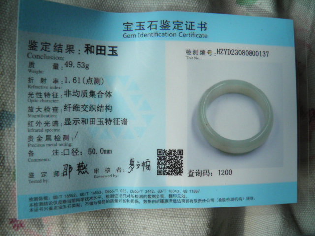 此手镯的鉴定证书照片: |