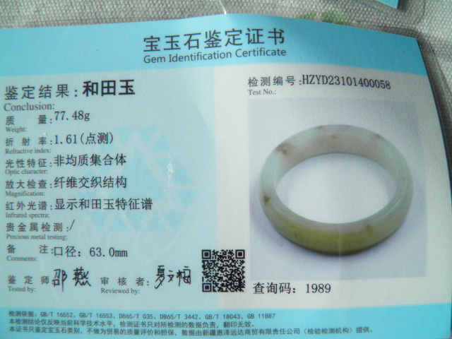 此手镯的鉴定证书照片: |