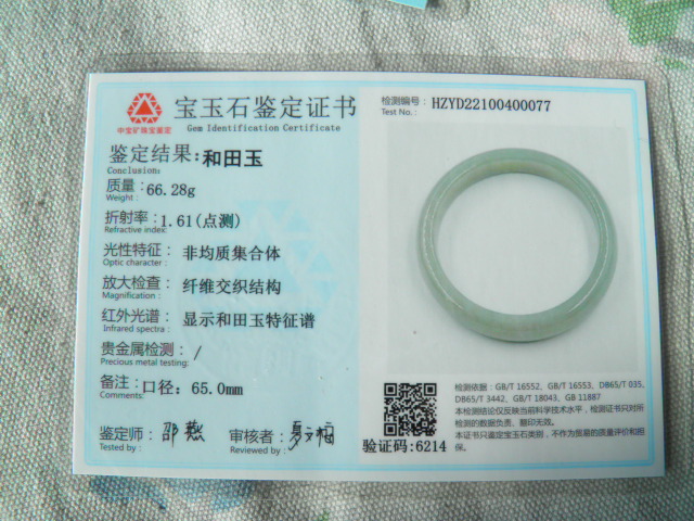 此手镯的鉴定证书照片: |