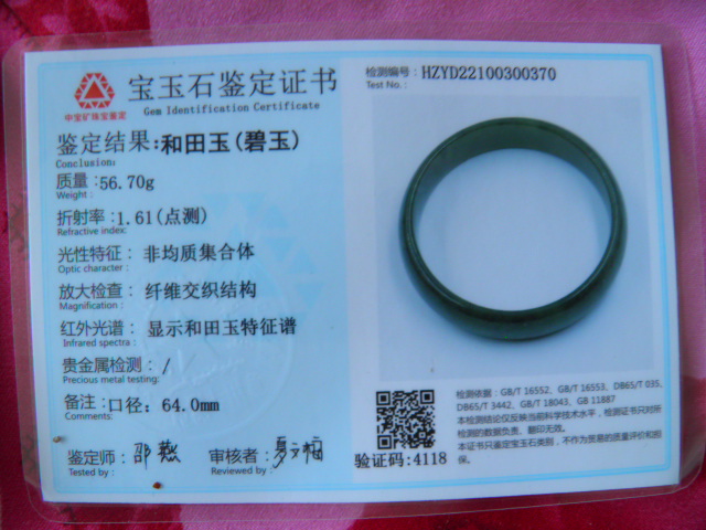 此手镯的鉴定证书照片: |
