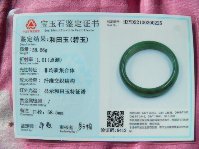 此手镯的鉴定证书照片: |