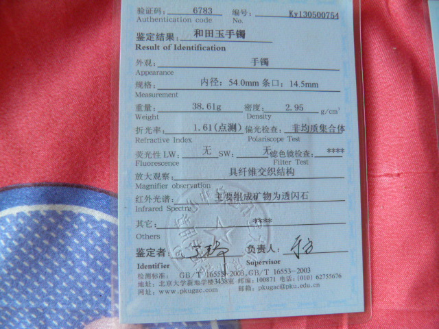 此手镯的鉴定证书照片: |