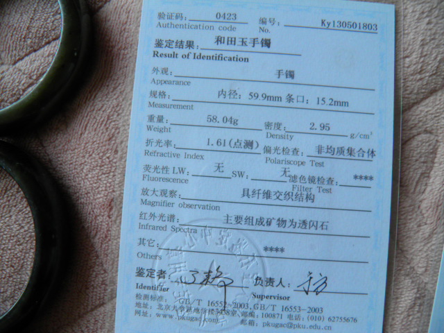 此手镯的鉴定证书照片: |
