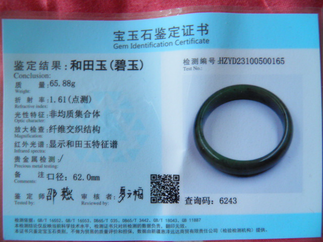 此手镯的鉴定证书照片: |