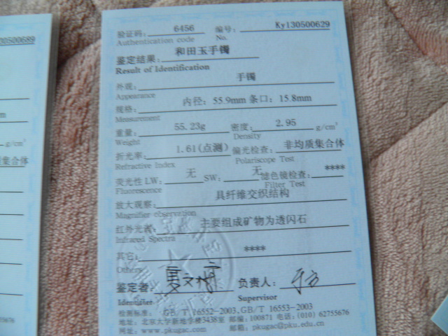 此手镯的鉴定证书照片: |