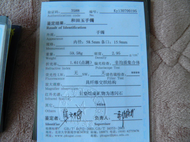此手镯的鉴定证书照片: |
