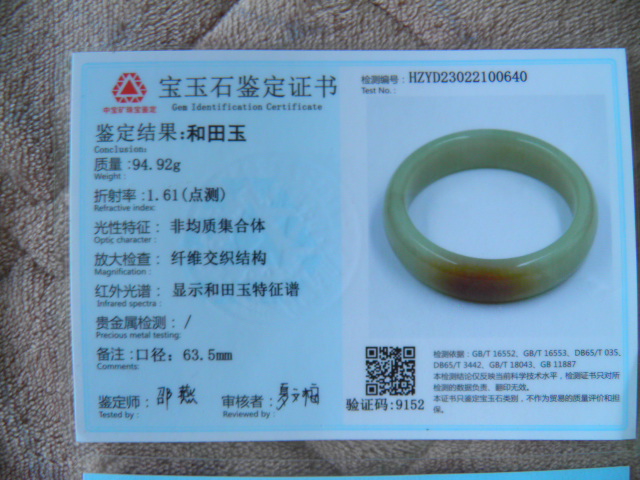 此手镯的鉴定证书照片: |