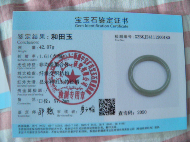 此手镯的鉴定证书照片: |