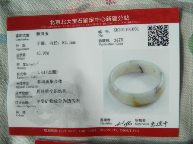 此手镯的鉴定证书照片: |