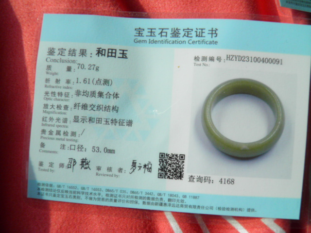 此手镯的鉴定证书照片: |