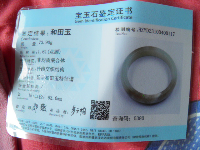 此手镯的鉴定证书照片: |