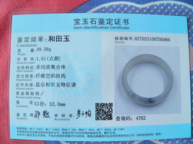 此手镯的鉴定证书照片: |
