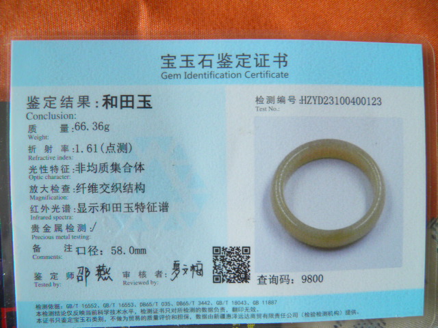此手镯的鉴定证书照片: |