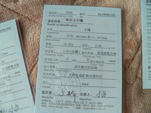此手镯的鉴定证书照片: |