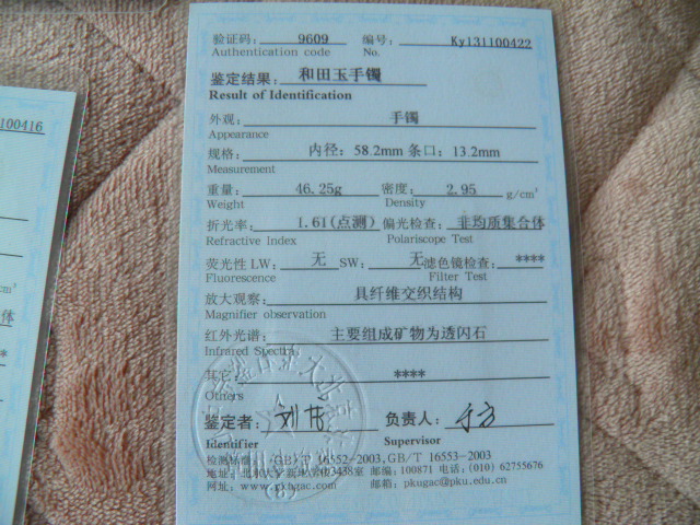 此手镯的鉴定证书照片: |