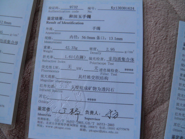 此手镯的鉴定证书照片: |