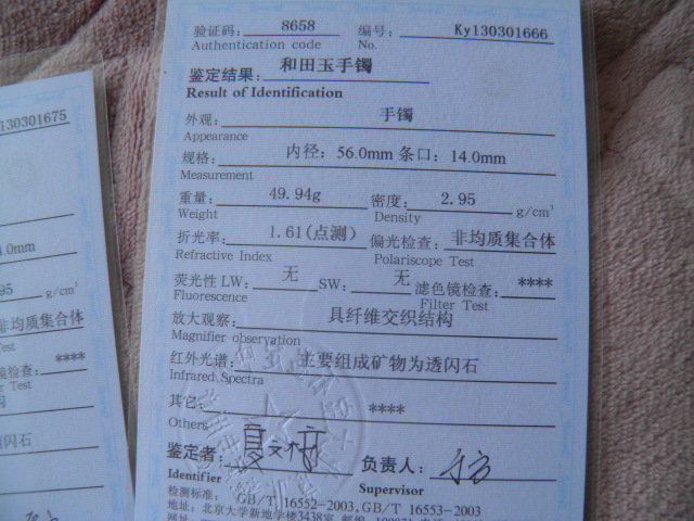 此手镯的鉴定证书照片: |